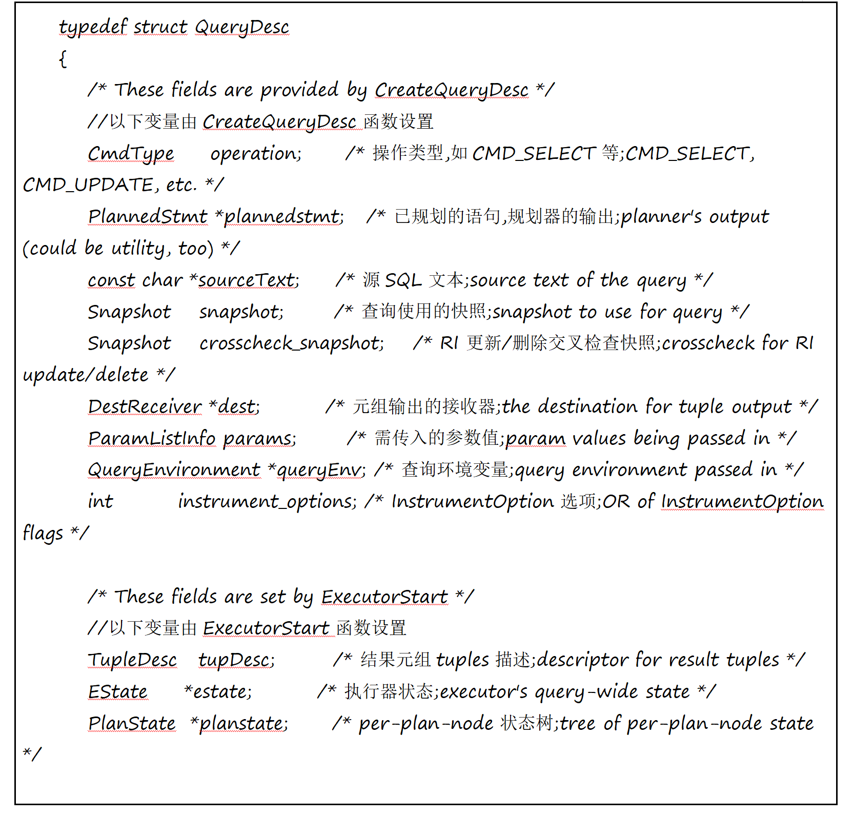 清理阶段。因为执行器在初始化阶段向系统申请了资源,所以在这个阶段要完成对资源的清理。比如在 HashJoin初始化时对 Hash表内存申请的释放。入口函数为 ExecutorFinish ()、ExecutorEnd ()3、执行器的主要数据结构分析QueryDescs: 查询描述符,实际是需要执行的SQL语句的相关信息,包含由CreateQueryDesc函数设置的操作类型、规划器的输出计划树、元组输出的接收器、查询环境变量以及由ExecutorStart函数设置的结果元组tuples描述、执行器状态、和per-plan-node状态树。具体结构如下: