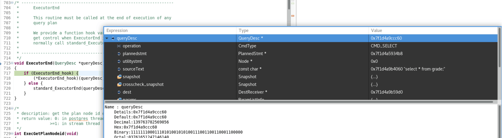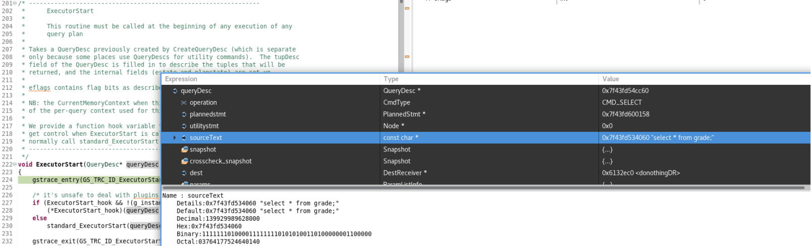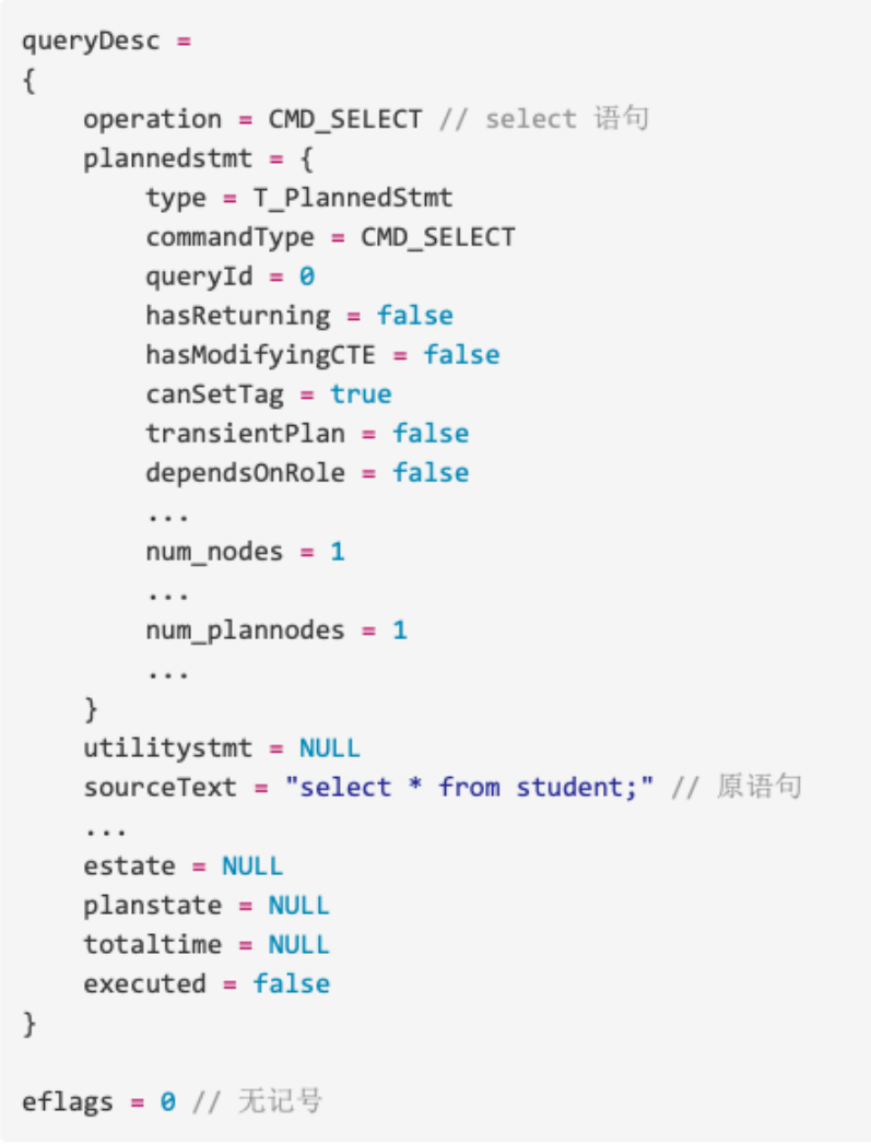 1、执行命令 select * from student; ,分析传入的数据结构queryDesc和eflags: