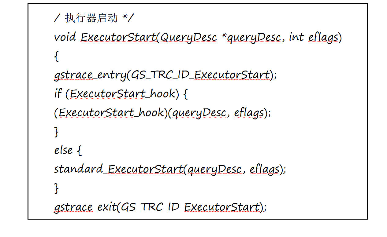 3、 explain_ExecutorStart 函数首先调用prev_ExecutorStart函数,而 prev_ExecutorStart 又挂载了 gs_audit_executor_start_hook 函数,该函数负责启动审计功能 4、之后调用了标准 ExecutorStart()函数。分别进入如下几个函数,进行了一些操作。