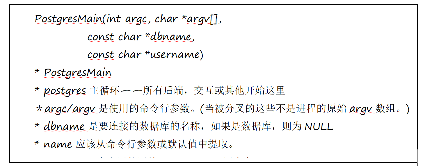PostgresMain首先进行一些初始化工作,然后使用语句for (; 进入一个无限循环状态,等待客户端发来命令请求,接受客户端命令,执行客户端命令,将执行结果返回给客户端。