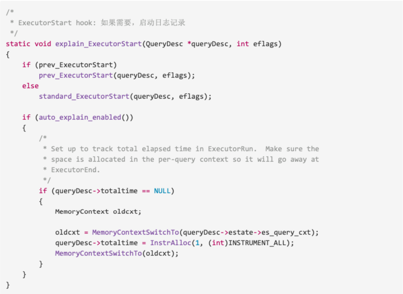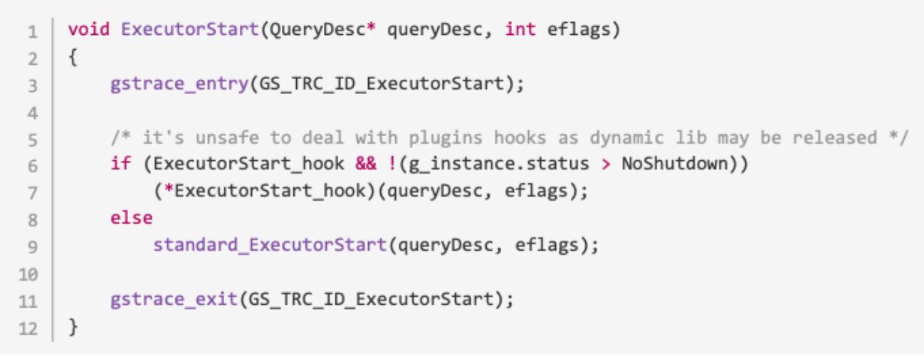 其中ExecutorStart_hook为钩子函数,是PostgreSQL预留的接口,通过重新编写的钩子函数可以改变postgresql的默认功能,钩子函数通常以hook最为结尾,PostgreSQL预留了非常丰富的接口。因此如果没有特殊需求,一般进入standard_ExecutorStart(queryDesc, eflags)函数。