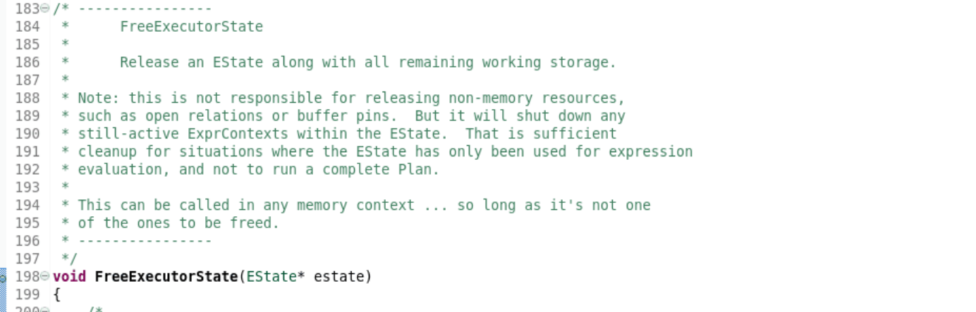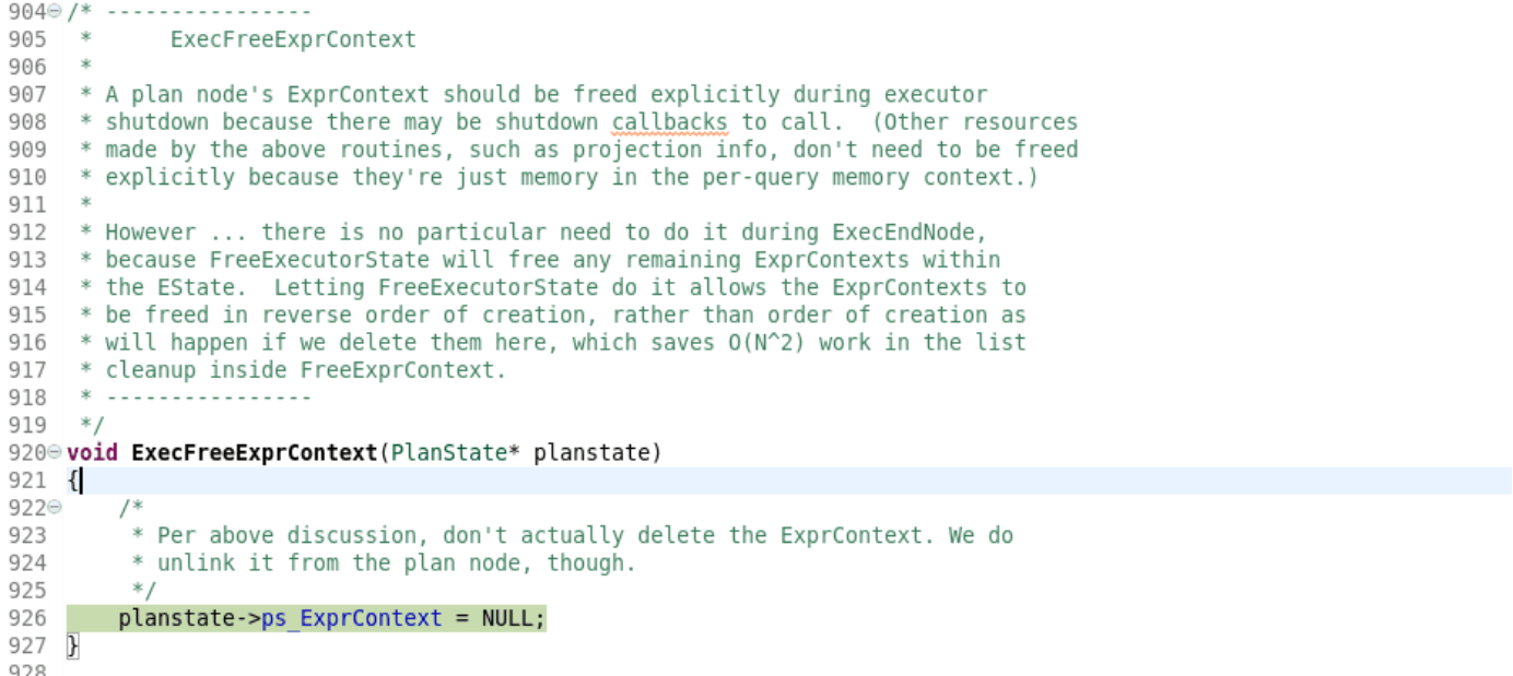 注意:这不是负责释放非内存资源,如打开关系或缓冲引脚。但是它将关闭EState内任何仍然活跃的exprcontext。对于EState仅用于表达式求值而不是运行完整的Plan的情况,这已经是足够的清理工作了这可以在任何内存上下文中调用…只要它不是被释放的那一种。