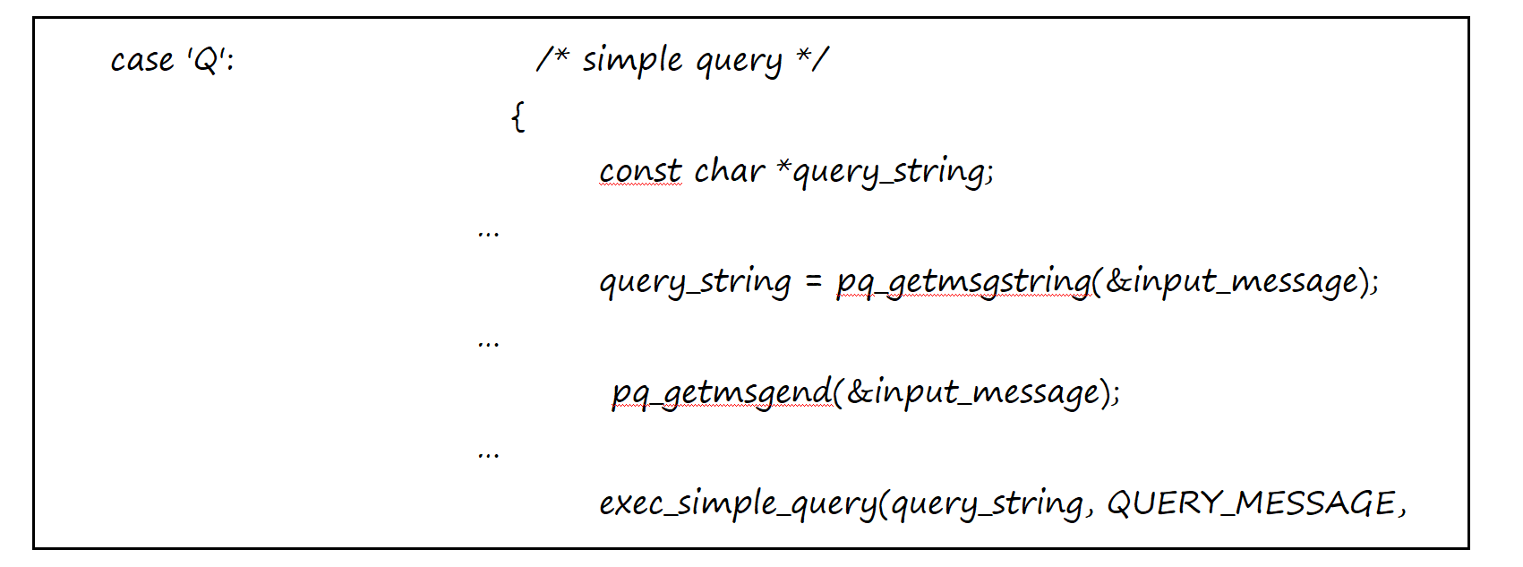 对于可以直接执行的SQL语句(simple query),命令类型的代码是“Q”,主要的处理代码如下: