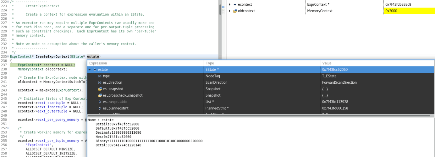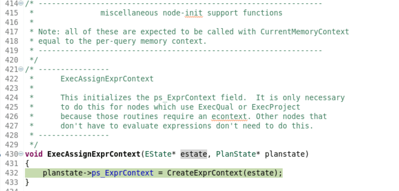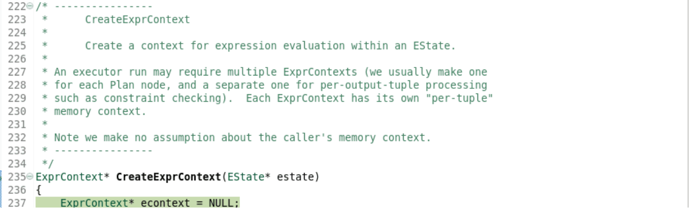正如注释所说,该函数负责跟踪嵌套深度。一旦深度超出限制,则抛出一个异常。 4、执行完成这部分后,进入到standard_ExecutorRun(queryDesc, direction, count);函数中调用了CreateExprContext函数,在EState中为表达式计算创建上下文。