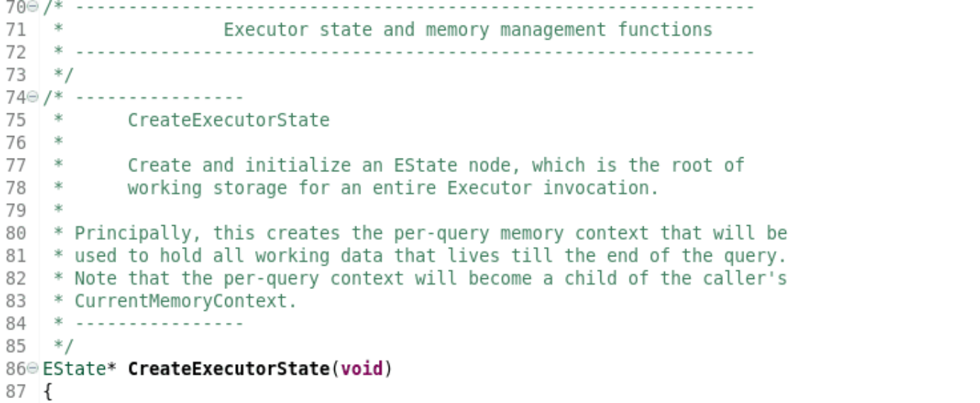 创建并初始化一个EState节点,它是用于整个Executor调用的工作存储。*主要地,这将创建每查询内存上下文用于保存直到查询结束为止的所有工作数据。