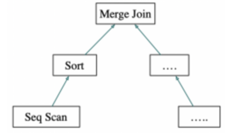 Merge Join由于要做归并操作,因此它要子计划按序返回元组,从图中可以看出,它的子计划是一个Sort节点。Sort的子节点可能是Seq Scan节点,代表对表的实际读取。执行SeqScan节点会使执行程序从表中获取一行并将其返回到调用节点。Sort节点将反复调用其子节点以获得所有要排序的行。当输入完毕时(如子节点返回NULL而不是新行),Sort算子对获取的元组进行排序,它每次返回1个元组,即已排序的第1行。然后不断排序并向父节点传递剩余的排好序的元组。