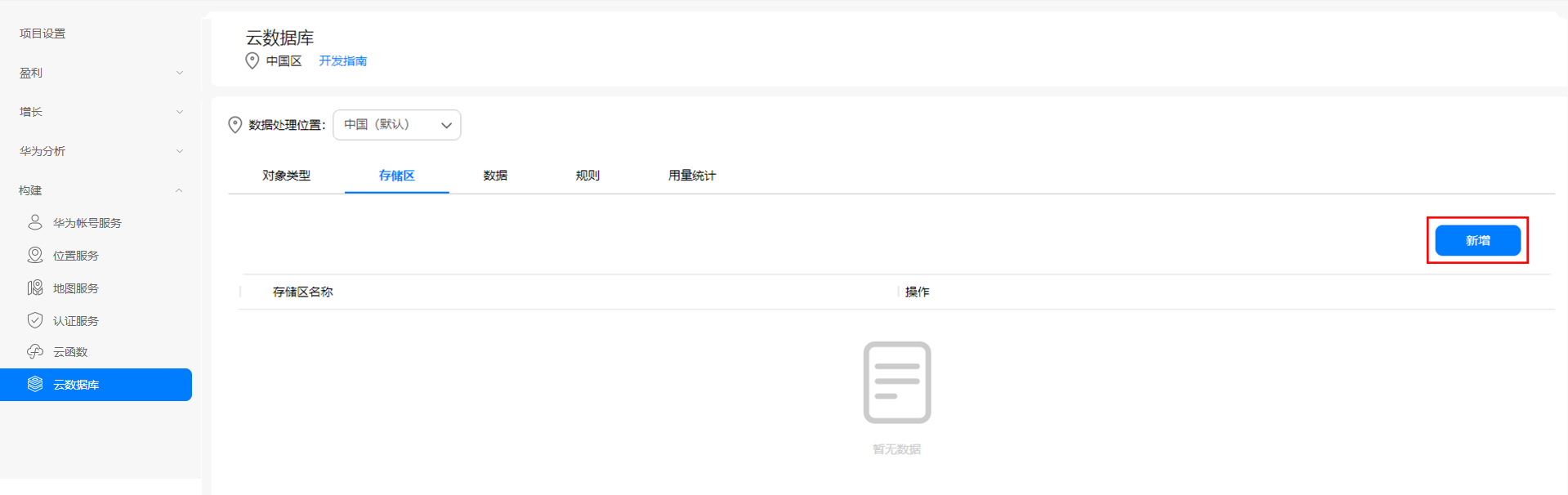 您可基于AppGallery Connect控制台在云侧创建数据存储区,请您遵循操作步骤创建一个存储区名称为“QuickStartDemo”的存储区。