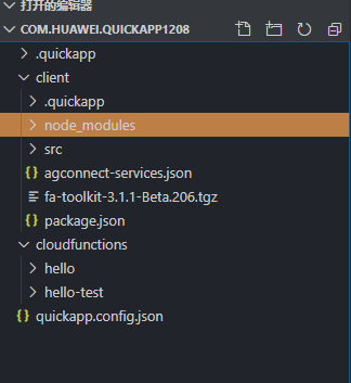 新建项目结构主要由quickapp.config.json、client、cloudfunctions组成。