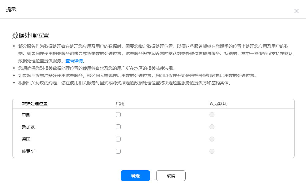 - (可选)如您还未选择数据处理位置,需要您先设置数据处理位置,具体操作请参见设置数据处理位置。