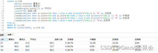 /*以如下形式显示:课程 ID,课程 name,最高分,最低分,平均分,及格率,中等率,优良率,优秀率
