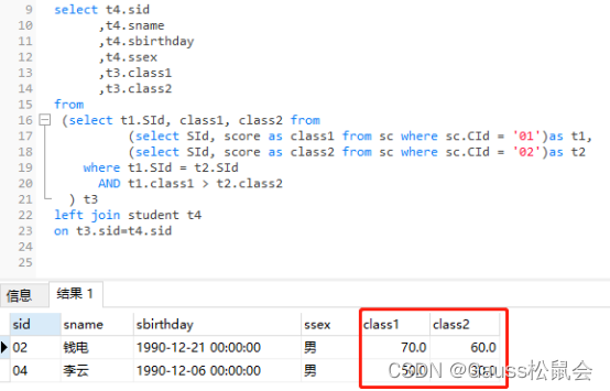 以学生id为主键,查找课程01 比02分数高的结果信息作为主表,然后与学生表关联。