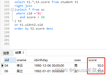 3、查询存在" 01 "课程但可能不存在" 02 "课程的情况(不存在时显示为 null )