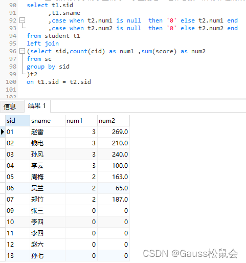 7、查询所有同学的学生编号、学生姓名、选课总数、所有课程的成绩总和