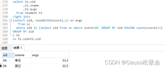 15、查询两门及其以上不及格(小于60分)课程的同学的学号,姓名及其平均成绩