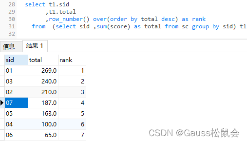 20、查询学生的总成绩,并进行排名,总分重复时不保留名次空缺