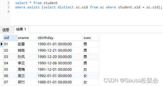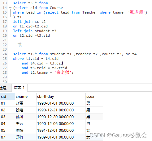 另一种解法也可以将教师表、课程表、成绩表先关联,然后再学生表中找到对应的学生信息