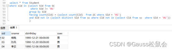 查询所选课程数量和01学生一样的学生,去掉所选课程中选了01学生未选课程的人