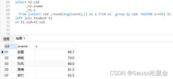 5、查询平均成绩大于等于 60 分的同学的学生编号和学生姓名和平均成绩