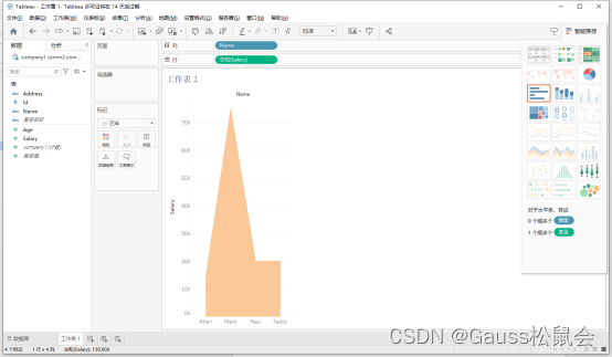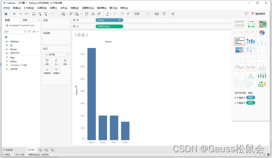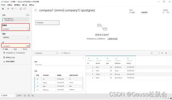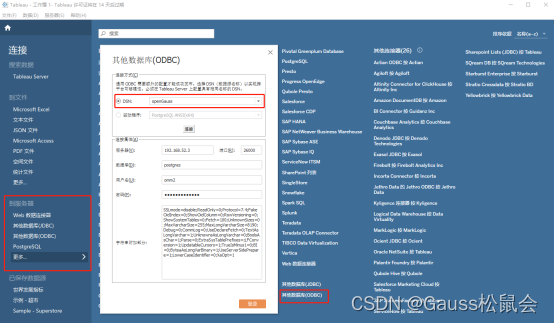 2)启动Tableau主程序 ,连接上文配置好的“openGauss”数据源,如下图: