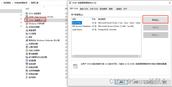 依次打开:控制面板-管理工具—ODBC 数据源(64 位)