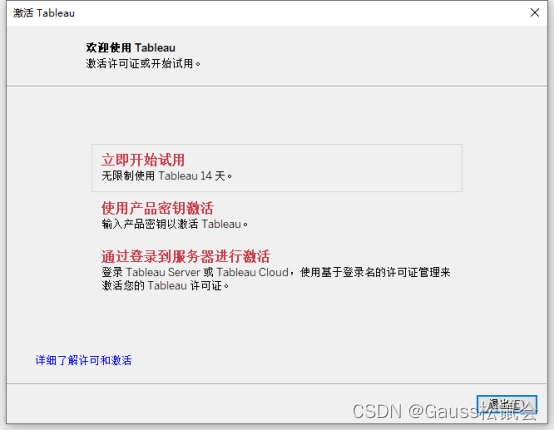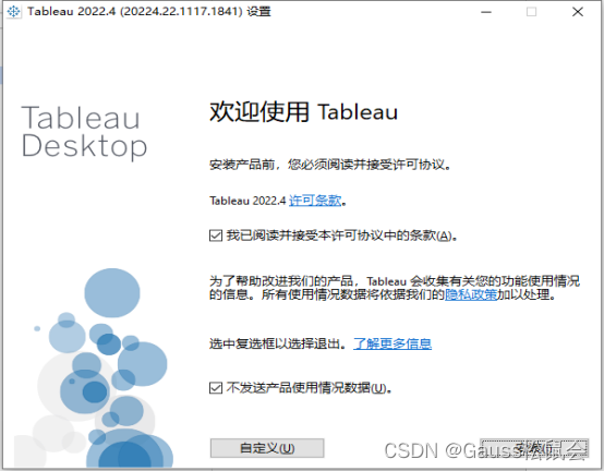 在官网或者第三方平台下载(购买/试用版)并安装Tableau 软件 (自定义安装——安装——完成——注册试用版),本文以“Tableau Desktop”版本为例。