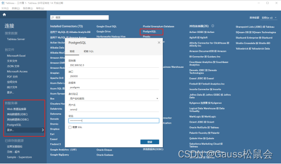 Tableau可以连接到多种数据库,包括关系型数据库,如MySQL,Oracle,Microsoft SQL Server,PostgreSQL等,以及非关系型数据库,如Hadoop,Amazon Redshift,Google BigQuery等。Tableau可以从数据库中提取数据,并将其可视化,以便更好地理解和分析数据。本文将简单介绍一下Tableau如何连接openGauss数据库。