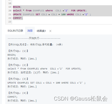 GaussDB支持事务语句,事务语句组合成一组原子性、隔离性和一致性的操作。例如,下面的所有查询都包含在同一个事务小片中。如果有任何一个查询失败,整个事务将回滚。以下是事务语句的例子: