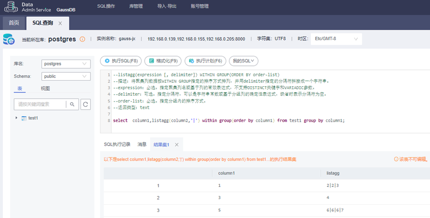 | --listagg(expression [, delimiter]) WITHIN GROUP(ORDER BY order-list) --描述:将聚集列数据按WITHIN GROUP指定的排序方式排列,并用delimiter指定的分隔符拼接成一个字符串。 --expression:必选。指定聚集列名或基于列的有效表达式,不支持DISTINCT关键字和VARIADIC参数。 --delimiter:可选。指定分隔符,可以是字符串常数或基于分组列的确定性表达式,缺省时表示分隔符为空。 --order-list:必选。指定分组内的排序方式。 --返回类型:text select column1,listagg(column2,'|') within group(order by column1) from test1 group by column1; |