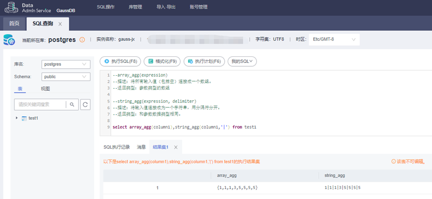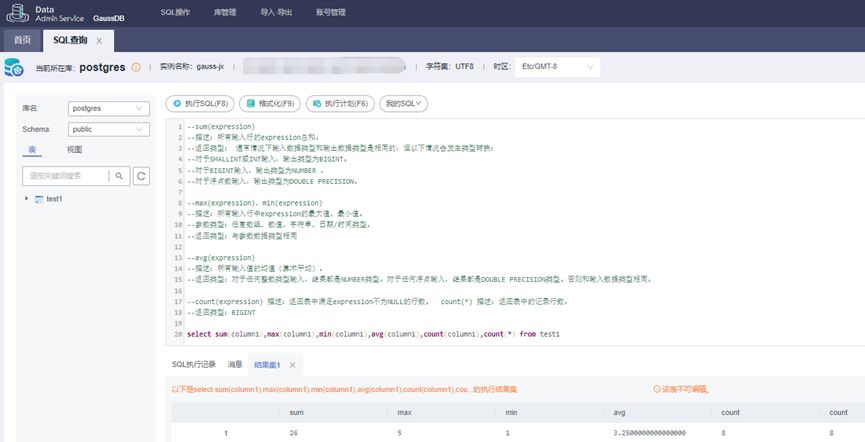 | --sum(expression) --描述:所有输入行的expression总和。 --返回类型: 通常情况下输入数据类型和输出数据类型是相同的,但以下情况会发生类型转换: --对于SMALLINT或INT输入,输出类型为BIGINT。 --对于BIGINT输入,输出类型为NUMBER 。 --对于浮点数输入,输出类型为DOUBLE PRECISION。 --max(expression)、min(expression) --描述:所有输入行中expression的最大值、最小值。 --参数类型:任意数组、数值、字符串、日期/时间类型。 --返回类型:与参数数据类型相同 --avg(expression) --描述:所有输入值的均值(算术平均)。 --返回类型:对于任何整数类型输入,结果都是NUMBER类型。对于任何浮点输入,结果都是DOUBLE PRECISION类型。否则和输入数据类型相同。 --count(expression) 描述:返回表中满足expression不为NULL的行数。 count(*) 描述:返回表中的记录行数。 --返回类型:BIGINT select sum(column1),max(column1),min(column1),avg(column1),count(column1),count(*) from test1 |