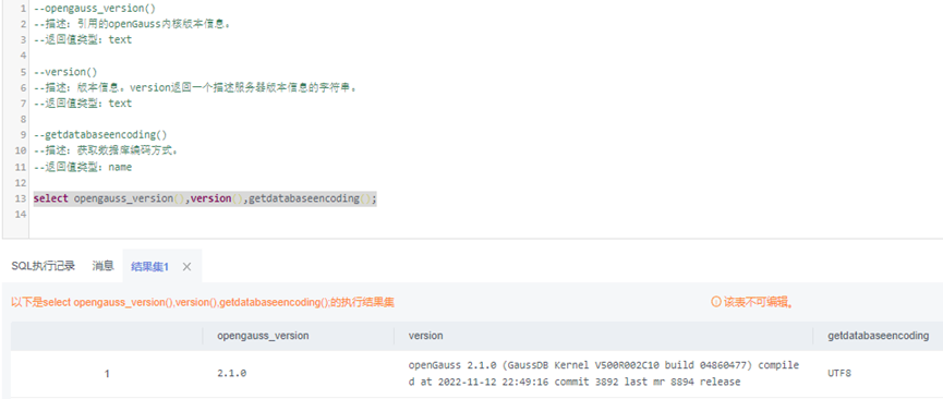 | --opengauss_version() --描述:引用的openGauss内核版本信息。 --返回值类型:text --version() --描述:版本信息。version返回一个描述服务器版本信息的字符串。 --返回值类型:text --getdatabaseencoding() --描述:获取数据库编码方式。 --返回值类型:name select opengauss_version(),version(),getdatabaseencoding(); |
