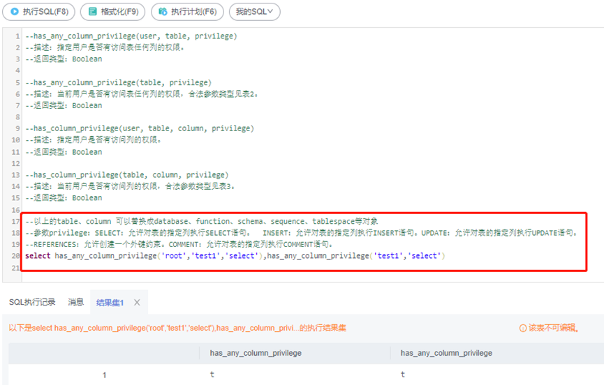 | --has_any_column_privilege(user, table, privilege) --描述:指定用户是否有访问表任何列的权限。 --返回类型:Boolean --has_any_column_privilege(table, privilege) --描述:当前用户是否有访问表任何列的权限,合法参数类型见表2。 --返回类型:Boolean --has_column_privilege(user, table, column, privilege) --描述:指定用户是否有访问列的权限。 --返回类型:Boolean --has_column_privilege(table, column, privilege) --描述:当前用户是否有访问列的权限,合法参数类型见表3。 --返回类型:Boolean --以上的table、column 可以替换成database、function、schema、sequence、tablespace等对象 --参数privilege:SELECT:允许对表的指定列执行SELECT语句。 INSERT:允许对表的指定列执行INSERT语句。UPDATE:允许对表的指定列执行UPDATE语句。 --REFERENCES:允许创建一个外键约束。COMMENT:允许对表的指定列执行COMMENT语句。 select has_any_column_privilege('root','test1','select'),has_any_column_privilege('test1','select') |