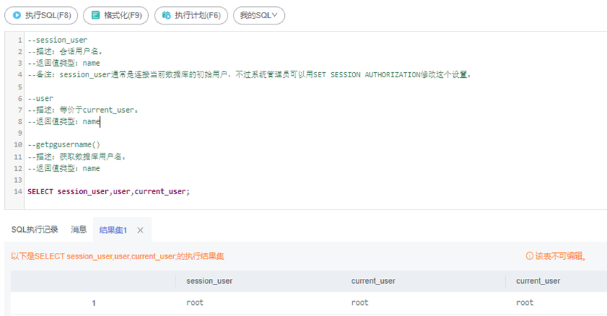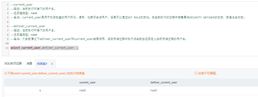| --current_user --描述:当前执行环境下的用户名。 --返回值类型:name --备注:current_user是用于权限检查的用户标识。通常,他表示会话用户,但是可以通过SET ROLE改变他。在函数执行的过程中随着属性SECURITY DEFINER的改变,其值也会改变。 --definer_current_user --描述:当前执行环境下的用户名。 --返回值类型:name --备注:大多数情况下definer_current_user和current_user结果相同,但在存储过程中执行该函数会返回定义当前存储过程的用户名。 select current_user,definer_current_user(); |