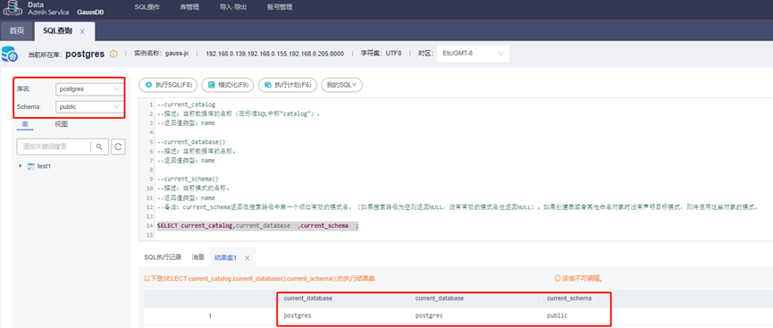 | --current_catalog --描述:当前数据库的名称(在标准SQL中称"catalog")。 --返回值类型:name --current_database() --描述:当前数据库的名称。 --返回值类型:name --current_schema() --描述:当前模式的名称。 --返回值类型:name --备注:current_schema返回在搜索路径中第一个顺位有效的模式名。(如果搜索路径为空则返回NULL,没有有效的模式名也返回NULL)。如果创建表或者其他命名对象时没有声明目标模式,则将使用这些对象的模式。 SELECT current_catalog,current_database(),current_schema(); |