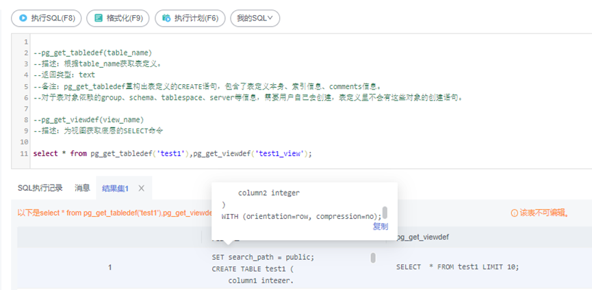 | --pg_get_tabledef(table_name) --描述:根据table_name获取表定义。 --返回类型:text --备注:pg_get_tabledef重构出表定义的CREATE语句,包含了表定义本身、索引信息、comments信息。 --对于表对象依赖的group、schema、tablespace、server等信息,需要用户自己去创建,表定义里不会有这些对象的创建语句。 --pg_get_viewdef(view_name) --描述:为视图获取底层的SELECT命令 select * from pg_get_tabledef('test1'),pg_get_viewdef('test1_view'); |