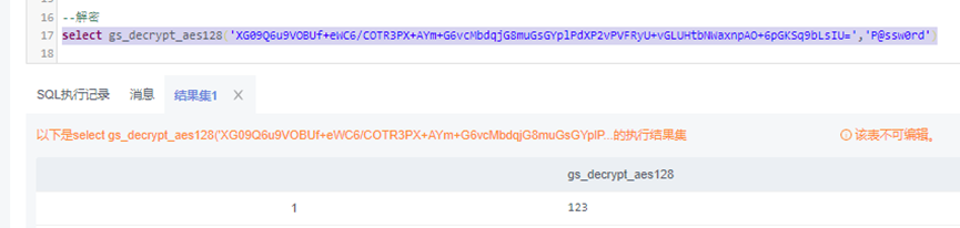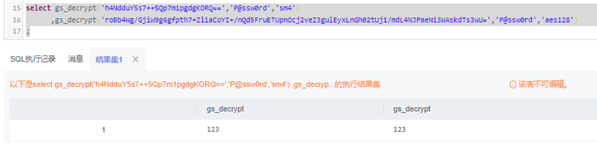--说明:由于该函数的执行过程需要传入解密口令,为了安全起见,gsql工具不会将包含该函数名字样的SQL记录入执行历史。即无法在gsql里通过上下翻页功能找到该函数的执行历史。