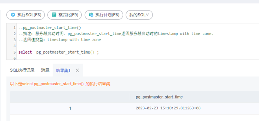 | --pg_postmaster_start_time() --描述:服务器启动时间。pg_postmaster_start_time返回服务器启动时的timestamp with time zone。 --返回值类型:timestamp with time zone select pg_postmaster_start_time() ; |