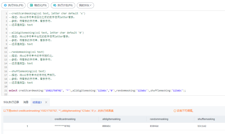 | --creditcardmasking(col text, letter char default 'x') --描述:将col字符串后四位之前的数字使用letter替换。 --参数:待替换的字符串、替换字符。 --返回值类型:text --alldigitsmasking(col text, letter char default '0') --描述:将col字符串中出现的数字使用letter替换。 --参数:待替换的字符串、替换字符。 --返回值类型:text --randommasking(col text) --描述:将col字符串中的字符随机化。 --参数:待替换的字符串、替换字符。 --返回值类型:text --shufflemasking(col text) --描述:将col字符串中的字符乱序排列。 --参数:待替换的字符串、替换字符。 --返回值类型:text select creditcardmasking('15021750702', '*'),alldigitsmasking('123abc','0'),randommasking('123abc'),shufflemasking('123abc'); |