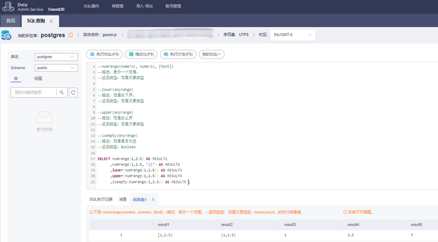 | --numrange(numeric, numeric, [text]) --描述:表示一个范围。 --返回类型:范围元素类型 --lower(anyrange) --描述:范围的下界。 --返回类型:范围元素类型 --upper(anyrange) --描述:范围的上界 --返回类型:范围元素类型 --isempty(anyrange) --描述:范围是否为空 --返回类型:Boolean SELECT numrange(1,2.5) AS RESULT1 ,numrange(1,2.5, '()') AS RESULT2 ,lower(numrange(1,2.5)) AS RESULT3 ,upper(numrange(1,2.5)) AS RESULT4 ,isempty(numrange(1,2.5)) AS RESULT5 ; |