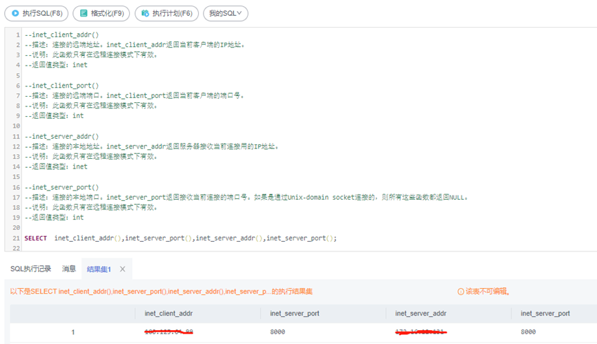 | --inet_client_addr() --描述:连接的远端地址。inet_client_addr返回当前客户端的IP地址。 --说明:此函数只有在远程连接模式下有效。 --返回值类型:inet --inet_client_port() --描述:连接的远端端口。inet_client_port返回当前客户端的端口号。 --说明:此函数只有在远程连接模式下有效。 --返回值类型:int --inet_server_addr() --描述:连接的本地地址。inet_server_addr返回服务器接收当前连接用的IP地址。 --说明:此函数只有在远程连接模式下有效。 --返回值类型:inet --inet_server_port() --描述:连接的本地端口。inet_server_port返回接收当前连接的端口号。如果是通过Unix-domain socket连接的,则所有这些函数都返回NULL。 --说明:此函数只有在远程连接模式下有效。 --返回值类型:int SELECT inet_client_addr(),inet_server_port(),inet_server_addr(),inet_server_port(); |