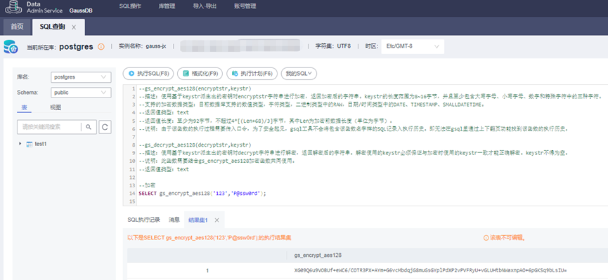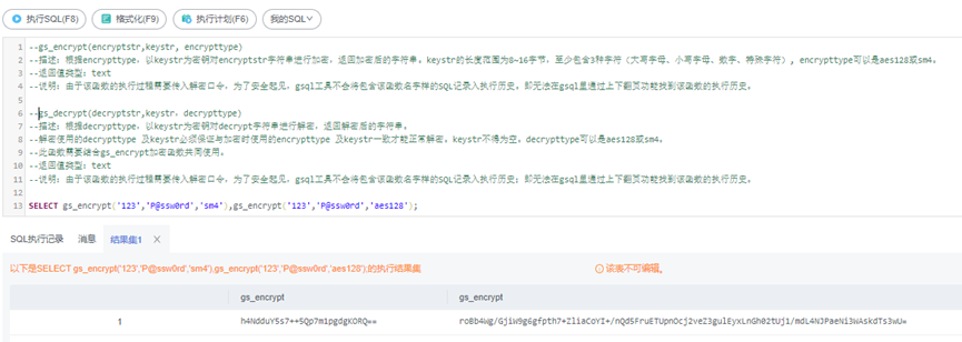 --说明:由于该函数的执行过程需要传入解密口令,为了安全起见,gsql工具不会将包含该函数名字样的SQL记录入执行历史;即无法在gsql里通过上下翻页功能找到该函数的执行历史。