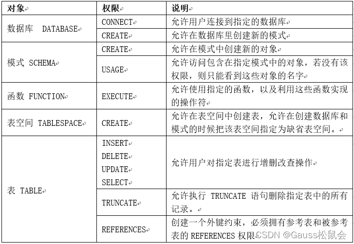 对象所有者的权限(例如ALTER、DROP、COMMENT、INDEX、VACUUM、GRANT和REVOKE)是隐式拥有的,即只要拥有对象就可以执行对象所有者的这些隐式权限。对象所有者可以撤消自己的普通权限。