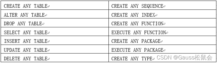 系统权限一般通过CREATE/ALTER ROLE语法来指定。其中,SYSADMIN权限可以通过GRANT/REVOKE ALL PRIVILEGE授予或撤销。但系统权限无法通过ROLE和USER的权限被继承,也无法授予PUBLIC。