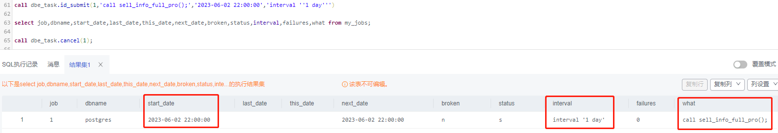 根据业务逻辑,查看相应的结果(此处略)。测试时可将定时“2023-06-02 22:00:00”改成立刻执行“sysdate”,然后查看执行结果。