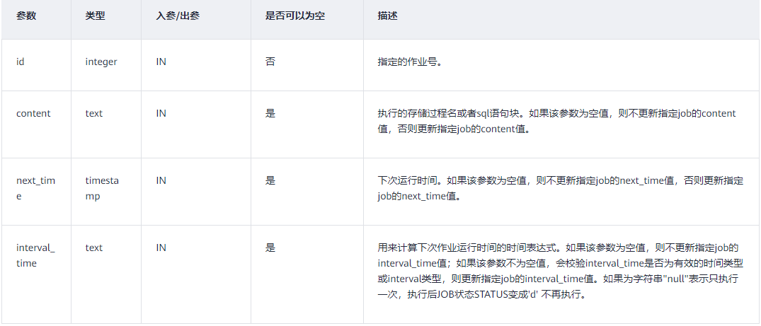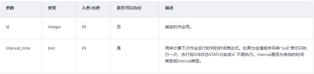 - interval_time:任务的执行间隔,例如 'interval ''1 day''' 表示每天执行一次。