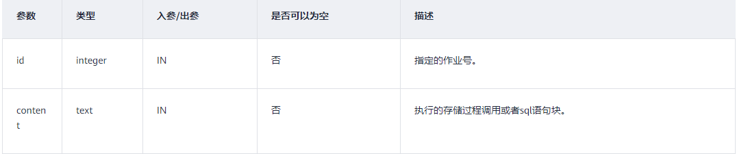 - task_name:要执行的SQL语句。支持一个或多个‘DDL’(不支持DB相关操作),‘DML’,‘匿名块’,‘调用存储过程的语句’或4种混合的场景。