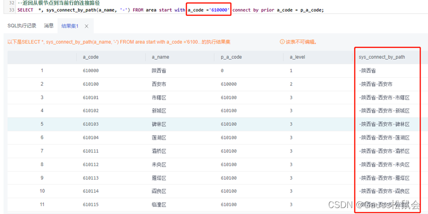 SELECT *, sys_connect_by_path(a_name, '-') FROM area start with a_code ='610000' connect by prior a_code = p_a_code;