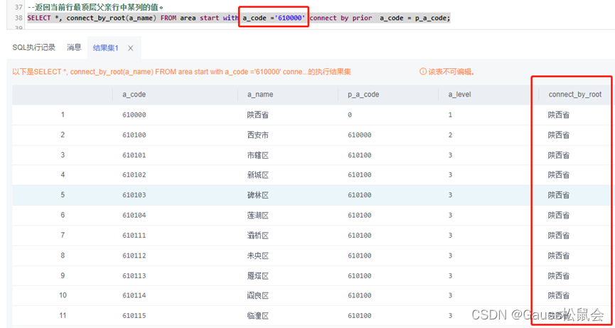 SELECT *, connect_by_root(a_name) FROM area start with a_code ='610000' connect by prior a_code = p_a_code;