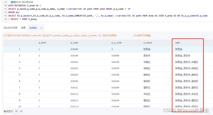 示例说明:这个查询使用了递归表达式来遍历省级行政区域关系。表达式使用了两个 SELECT 语句:第一个 SELECT 语句选取了所有父级代码为0的行政区域信息,并将它们添加到临时表 t_area 中。它们的层级选取初始化的a_level级,并且它们的路径被设置为它们的行政区名a_name。这个 SELECT 语句是递归查询的起点。第二个 SELECT 语句连接了 area表和t_area表。它选取了area表中所有具有父级行政区,并连接到t_area表中已经存在的行政区。对于每个连接的行,它们的层级是父级的层级加1,并且它们的路径是父级的路径加上逗号和它们自己的行政区。查询结果返回t_area表中所有的行政区信息。