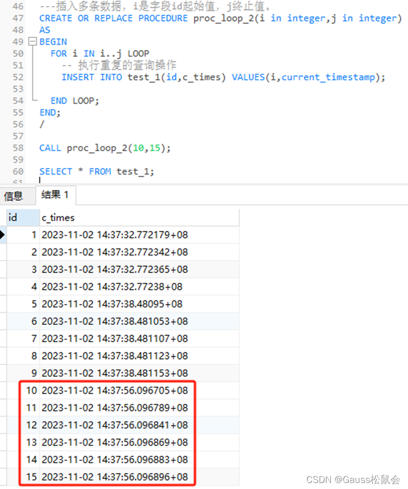 | ---插入多条数据,i是字段id起始值,j终止值。 CREATE OR REPLACE PROCEDURE proc_loop_2(i in integer,j in integer) AS BEGIN FOR i IN i..j LOOP -- 执行重复的查询操作 INSERT INTO test_1(id,c_times) VALUES(i,current_timestamp);