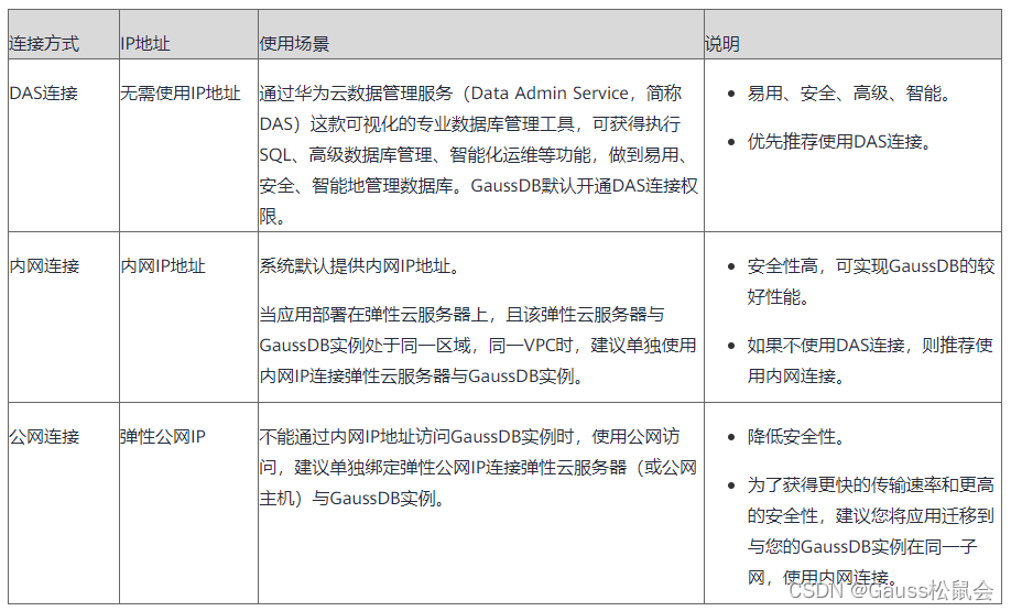 GaussDB提供使用内网、公网和数据管理服务(Data Admin Service,简称DAS)的连接方式。
